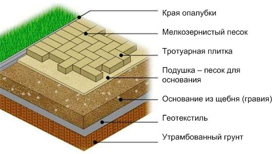 Для подготовки основания под тротуарную плитку используется щебень, геотекстиль и песок. Засыпка и утрамбовка производится в строго определённой последовательности. Щебень служит в качестве подложки и обеспечивает дренаж, а с помощью песка происходит выравнивание поверхности. Геотекстиль укладывают между щебнем и песком — таким образом обеспечивается защита от смешивания этих слоёв и образования провалов в тротуарном покрытии.